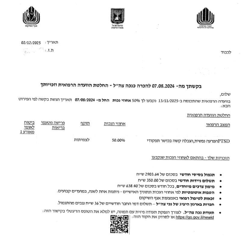 ליוויתי אותו לועדה והוא הוכר כסובל מפוסט טראומה בדרגת נכות של 50% ולצמיתות.