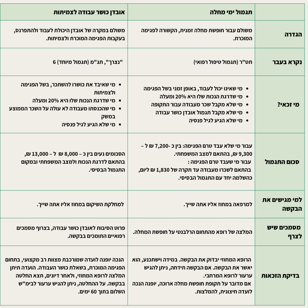 טבלת השוואה – אובדן כושר עבודה מלא תגמול מול ימי מחלה